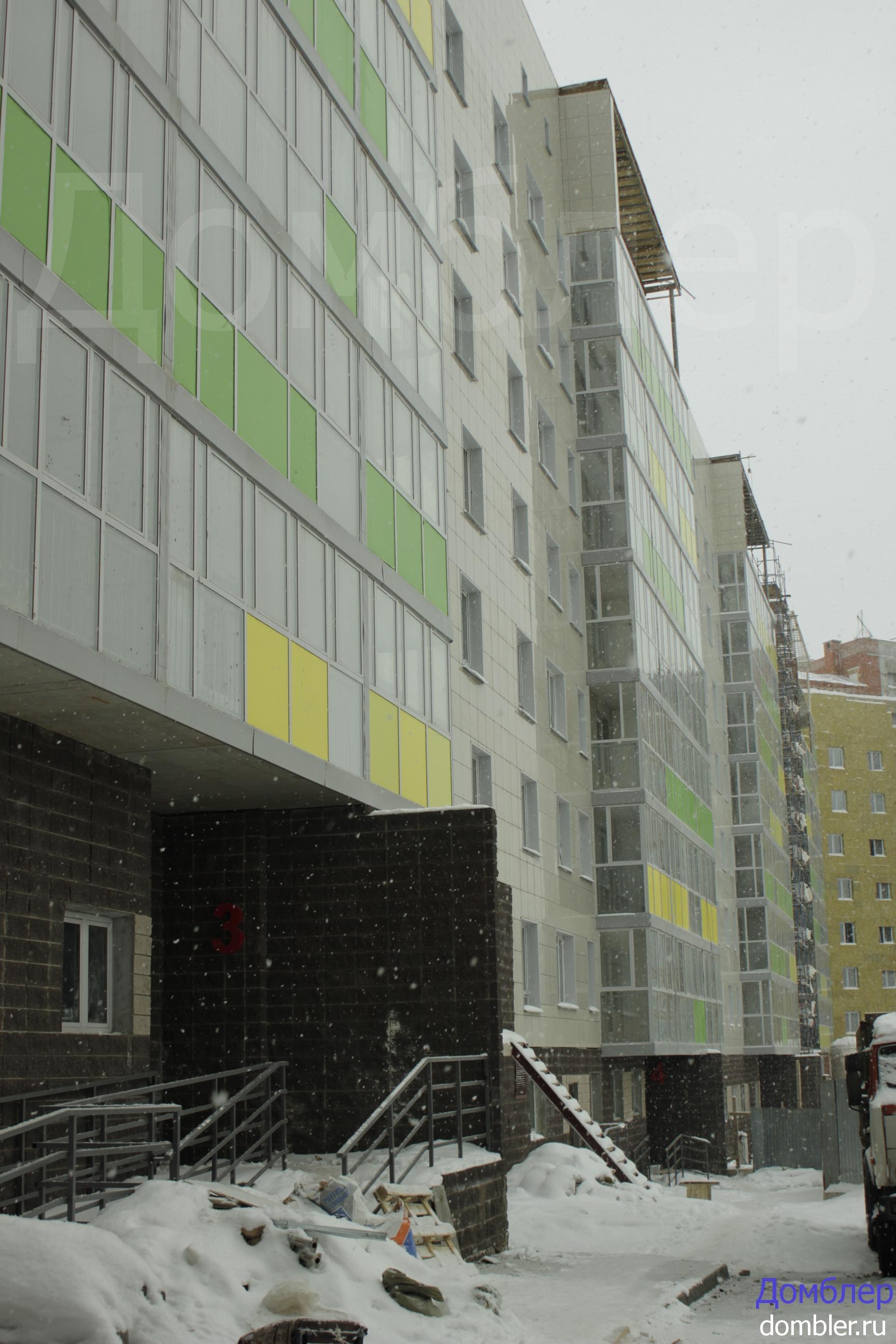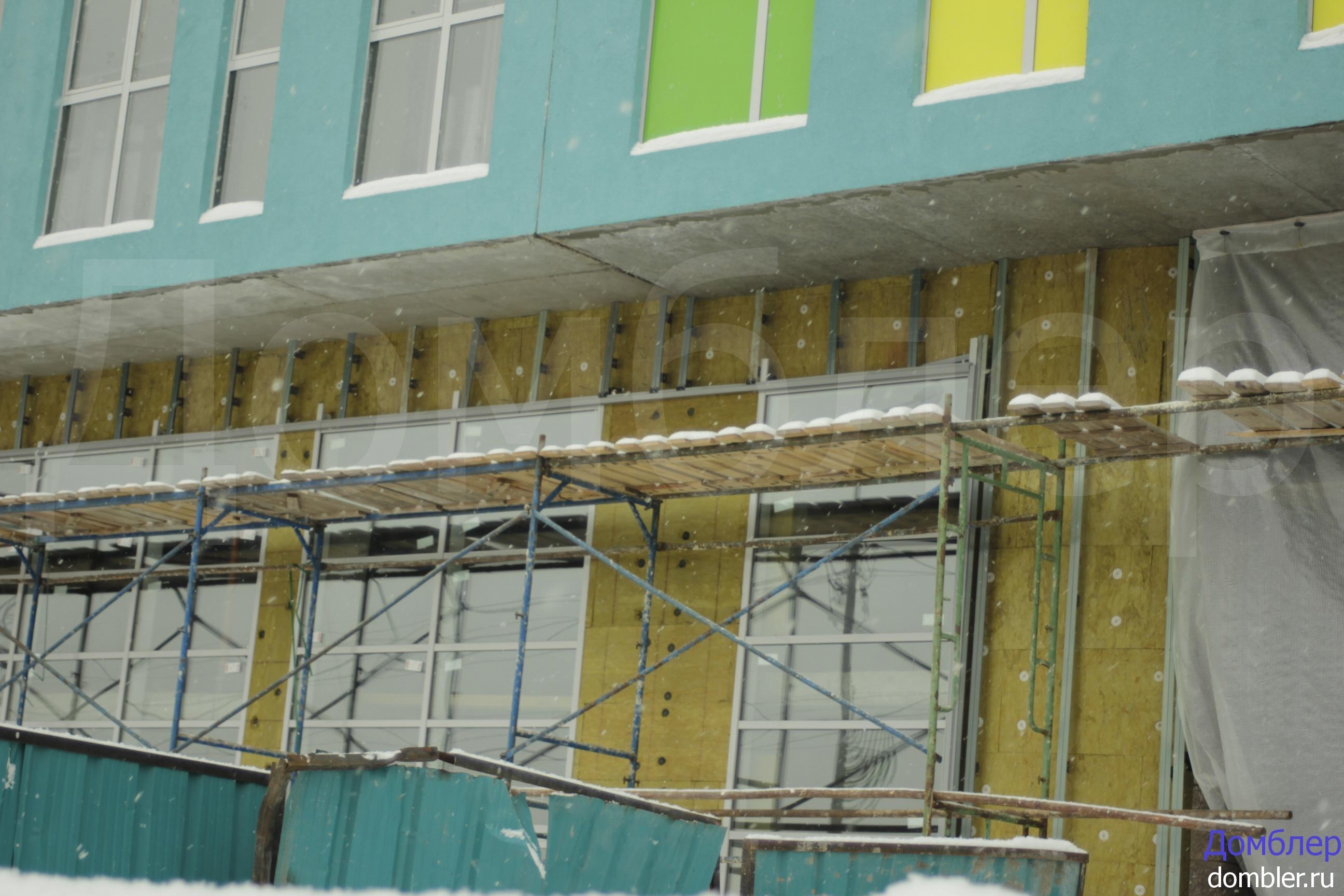 Со стороны ул.З.Валиди дом выглядит на 100% готовым, что не скажешь про вид со двора. Но там не всё так плохо. Рабочие крепили утеплитель, который был заранее распределён по строительным лесам. Во всём доме полностью установлены стеклопакеты. В подъездах установлены двери, первый этаж облицован декоративной плиткой.