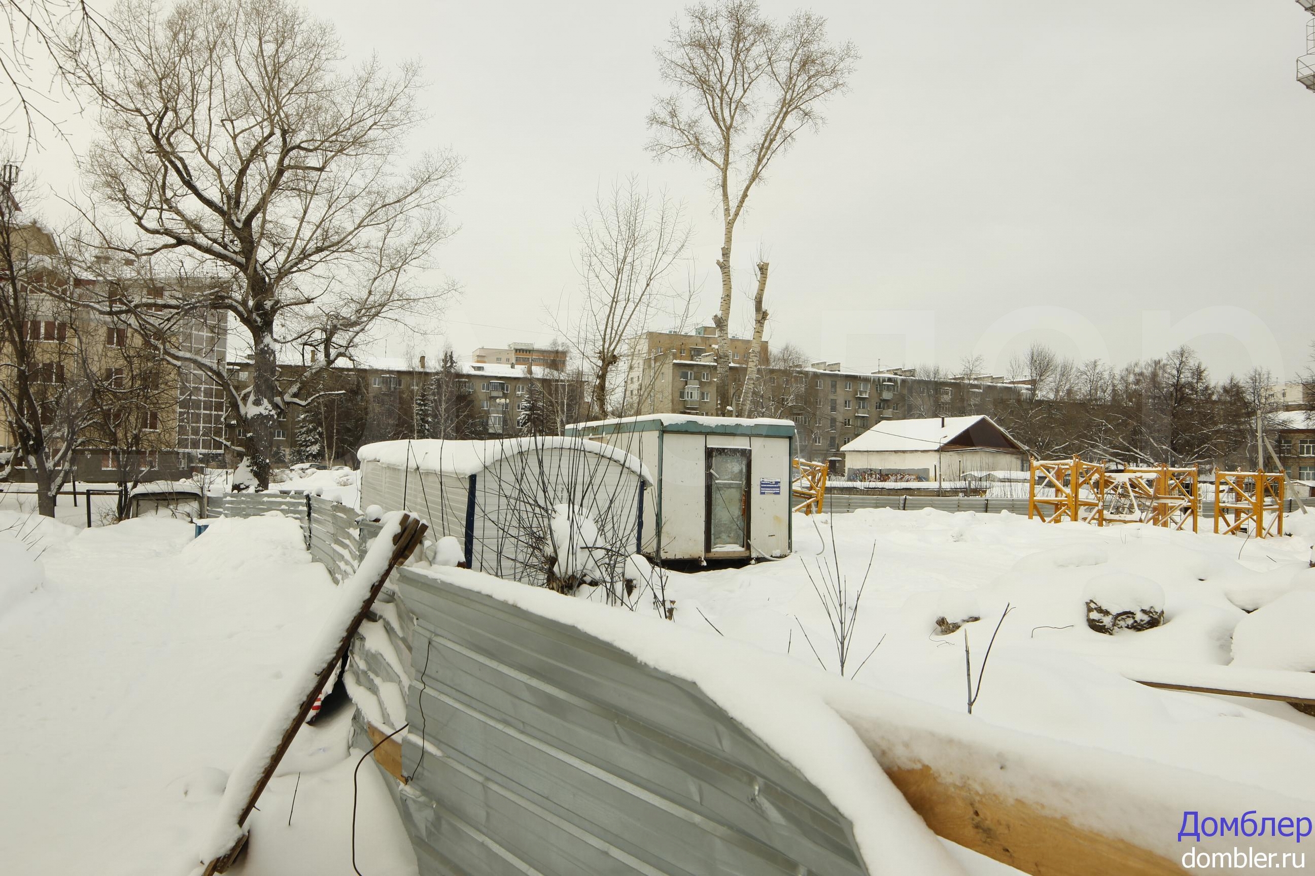 Дом находится на стадии фундамента. Башенный кран собран, но не полностью. Рабочих обнаружено не было. Котлован занесён снегом.