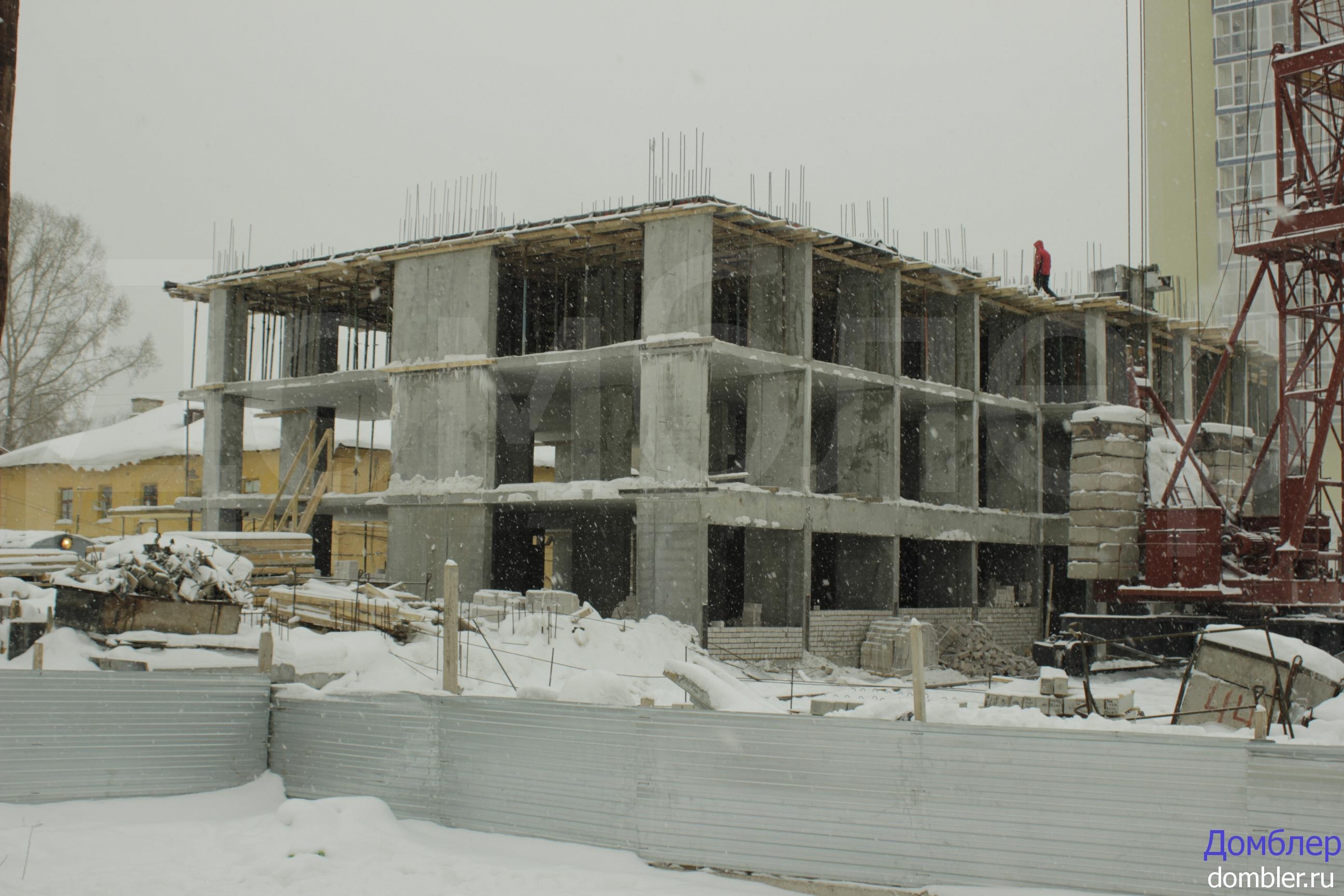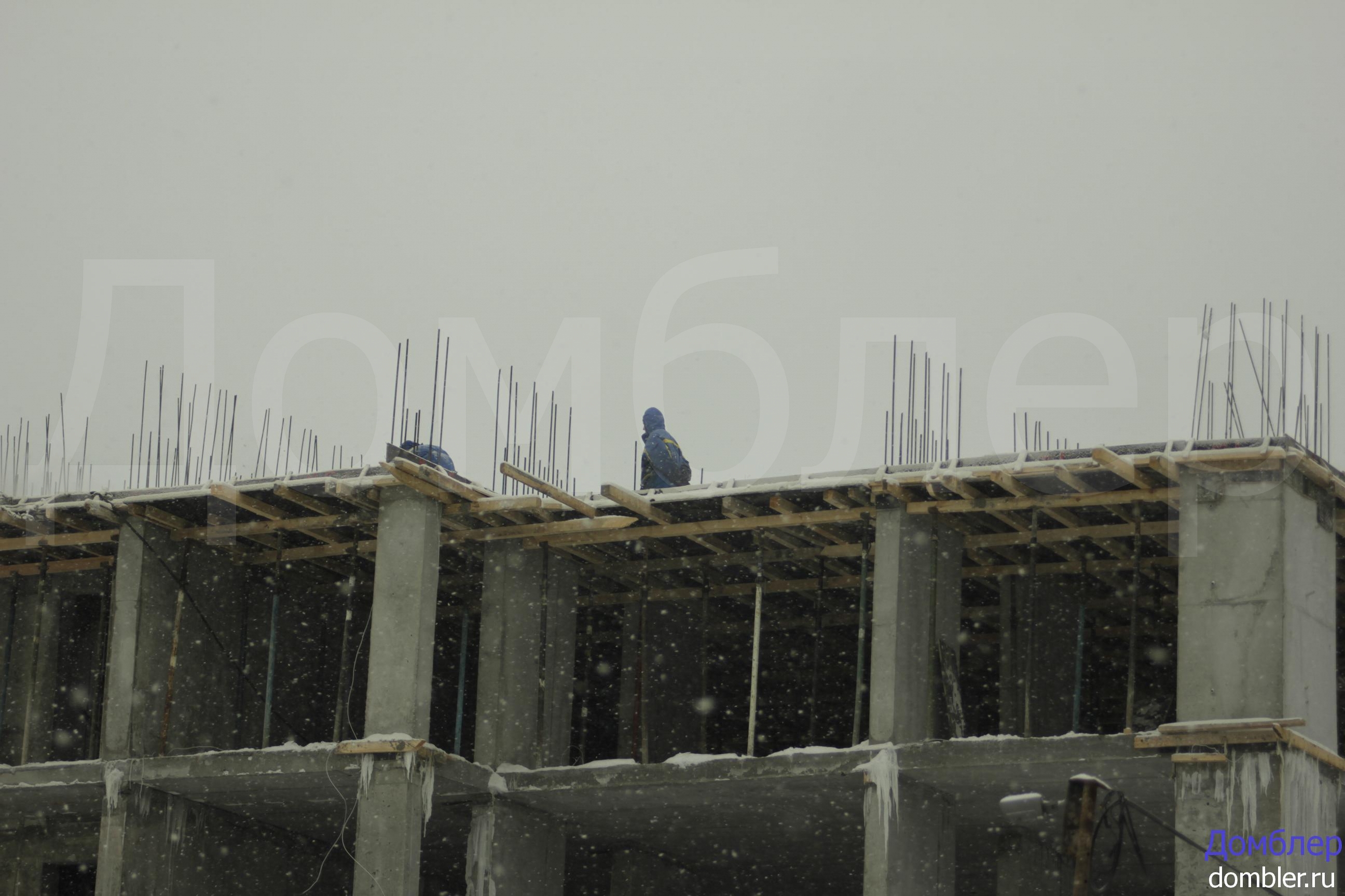 На момент моего посещения активно велись работы. Возведено три этажа, на данный момент. Идёт подготовка к заливке четвёртого. На фото видно, как рабочий продувает снег с опалубки четвёртого этажа компрессорной установкой. За ходом работы следит прораб. На первом этаже началась кладка кирпича. Материал на участок поступает по мере надобности.