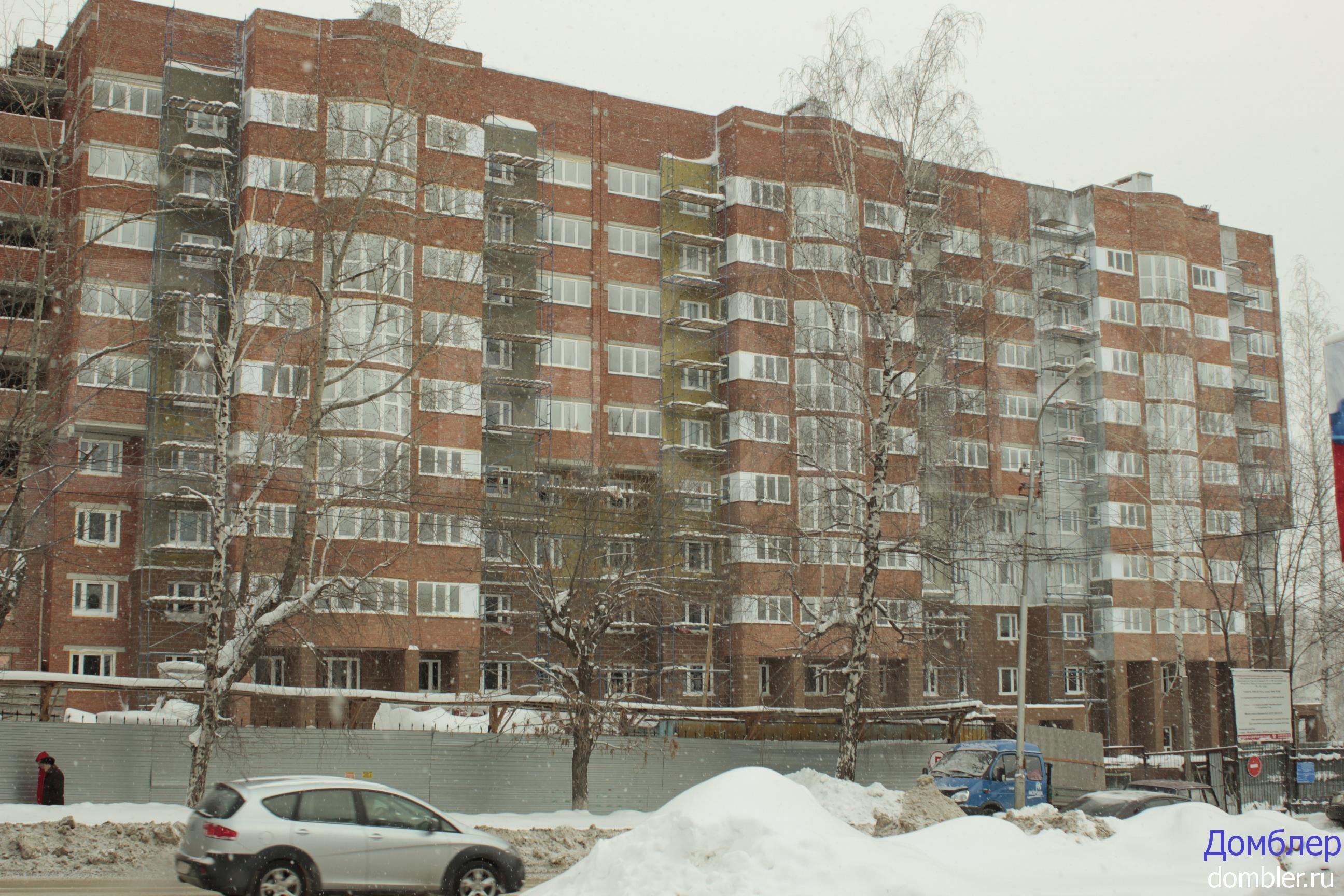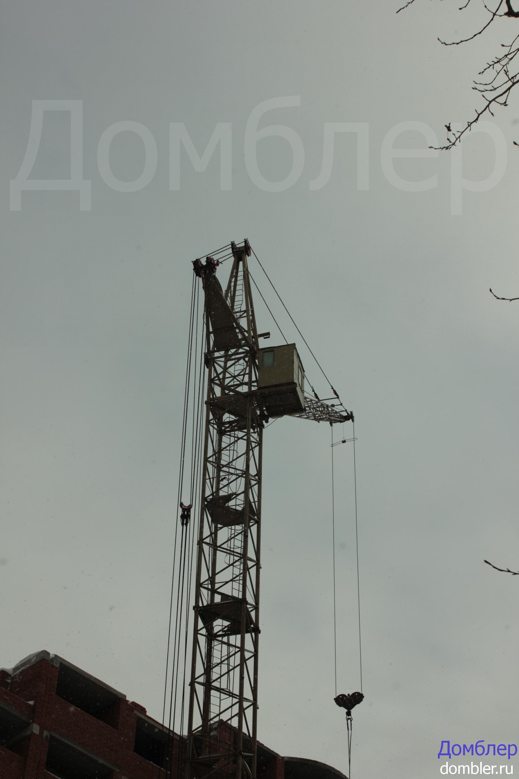 Дом № 12а достроен до одиннадцатого этажа. Окна не вставлены. Над домом работает башенный кран.